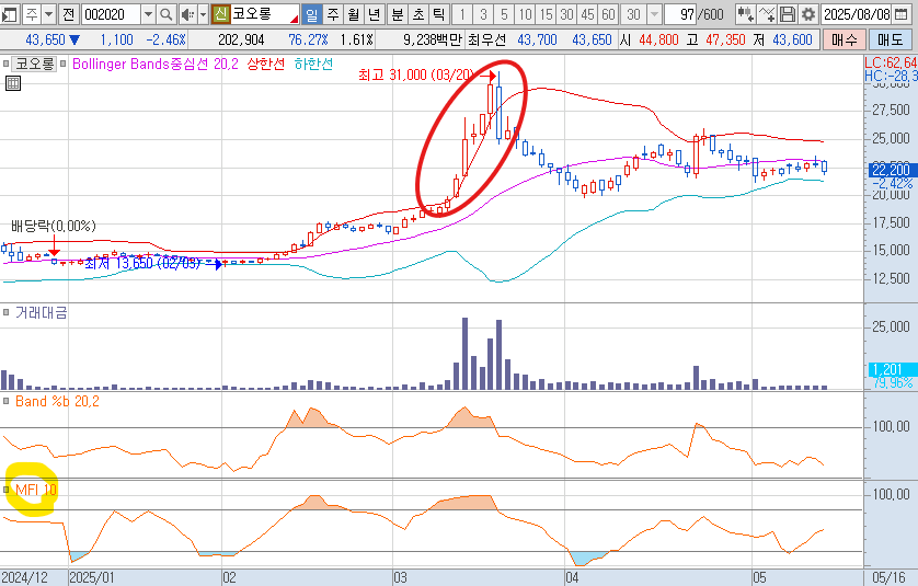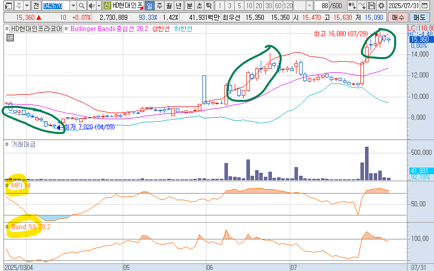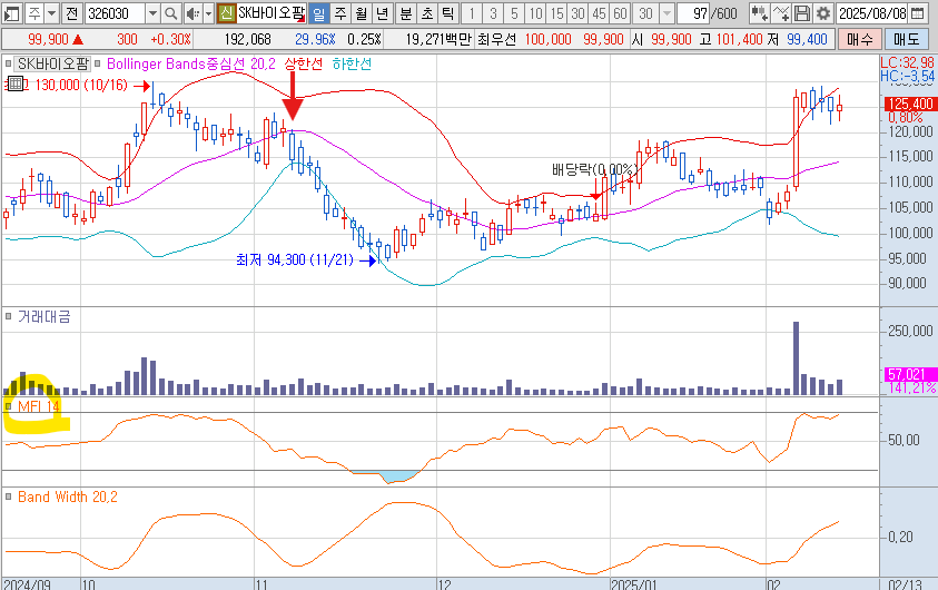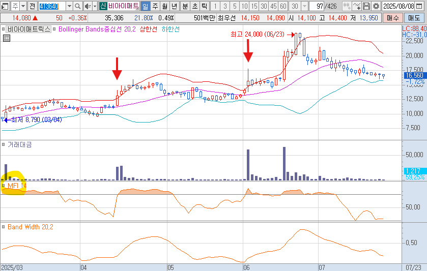 수식 산출기간의 경우, 볼린저 밴드는 20일, MFI는 10일로 한다.