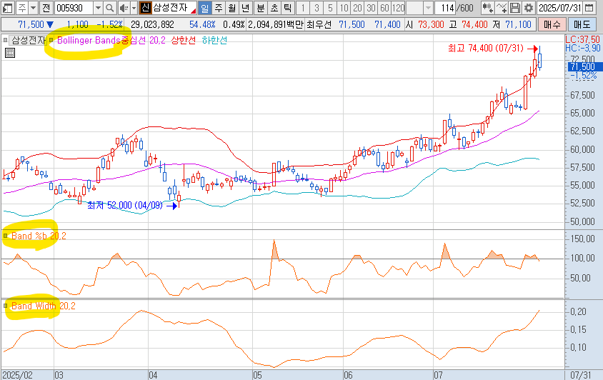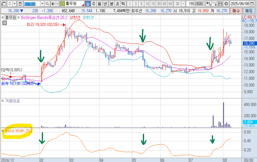 상단, 하단 : 중간선 ± (20일 변동성의 표준편차)x2