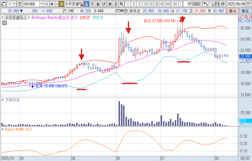 - 밴드폭이 좁고, 하단 밴드를 돌파하면 하락 추세를 기대한다.