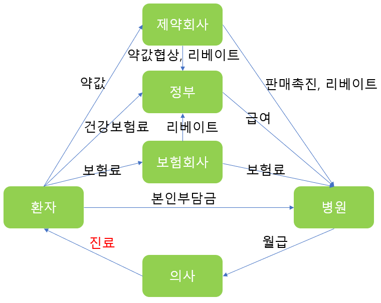 정부 : 수가를 결정하는 강력한 주체다. 건강보험료는 올리고 병원 수가 지급률은 줄일수록 좋다.