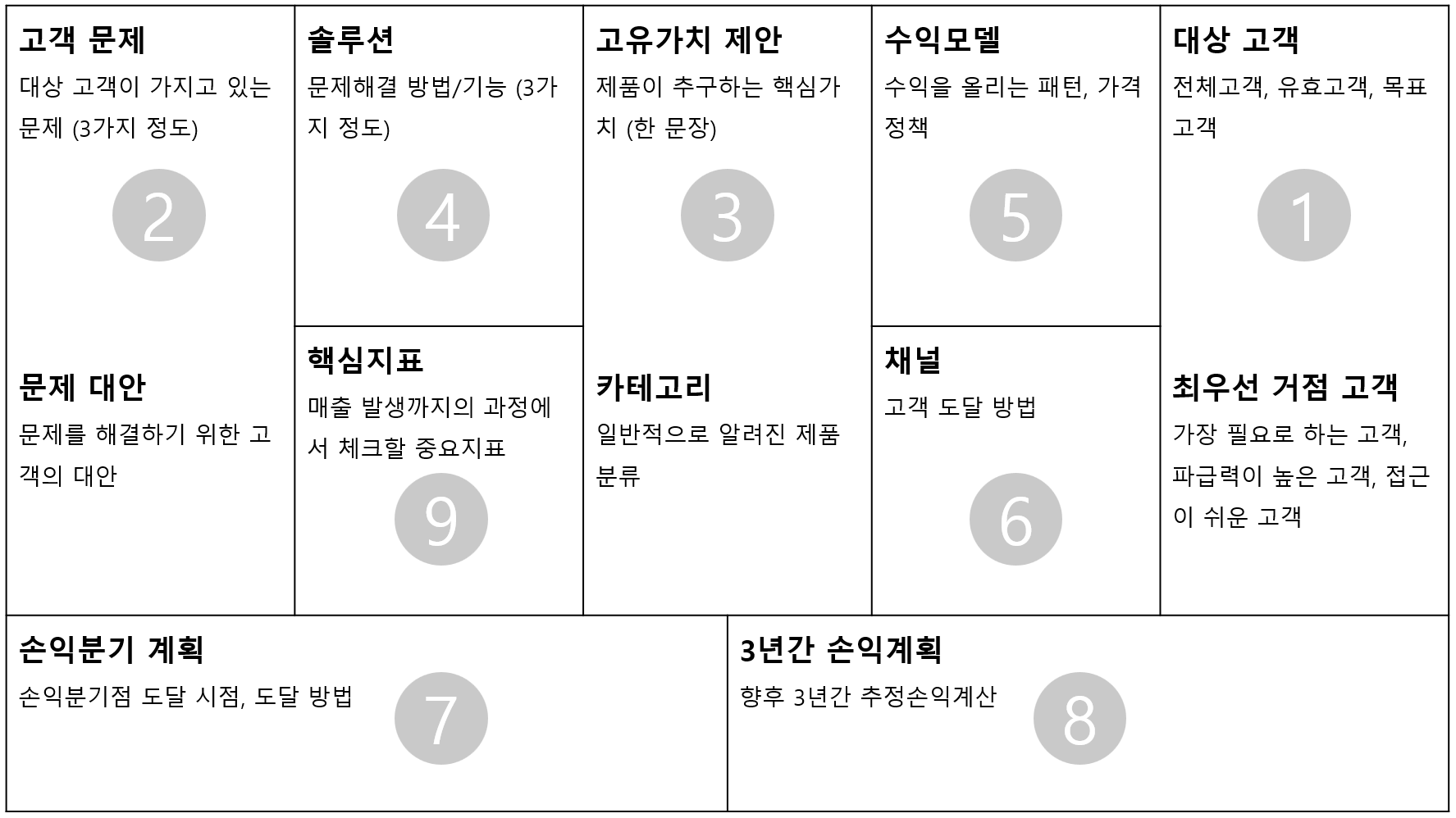 우선 린 보드를 작성한다. 대상 고객 → 고객 문제 → 고유가치 제안 → 솔루션 → 수익모델 → 채널 → 손익분기 계획 → 3년간 손익계획 → 핵심지표 순으로 작성해 본다.