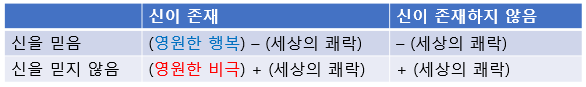 신이 존재하는 경우, 신을 믿으면 큰 보상을 얻고, 믿지 않으면 큰 형벌을 받는다. 신이 존재하지 않는 경우, 신을 믿는다고 해도 큰 비용이 발생하지 않는다. 따라서 신을 믿는 것에 베팅하는 것이 더 합리적인 선택이다.